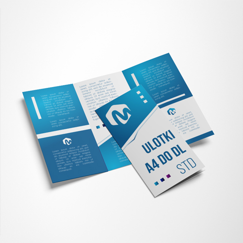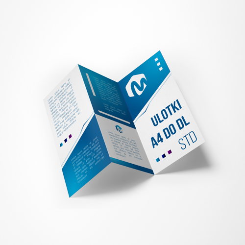 Ulotki A4 składane do DL w "Z"Ulotka formatu A4 oferuje, dużą ilość czytelnej treści. Ulotki formatu A4 są również bardzo uniwersalne. Ulotki drukujemy na papierze kredowym 130g, błyszczącym. Cyfra przy nakładzie oznacza gramaturę papieru. Zlecenia złożone po godzinie 12 przechodzą na następny dzień roboczy.